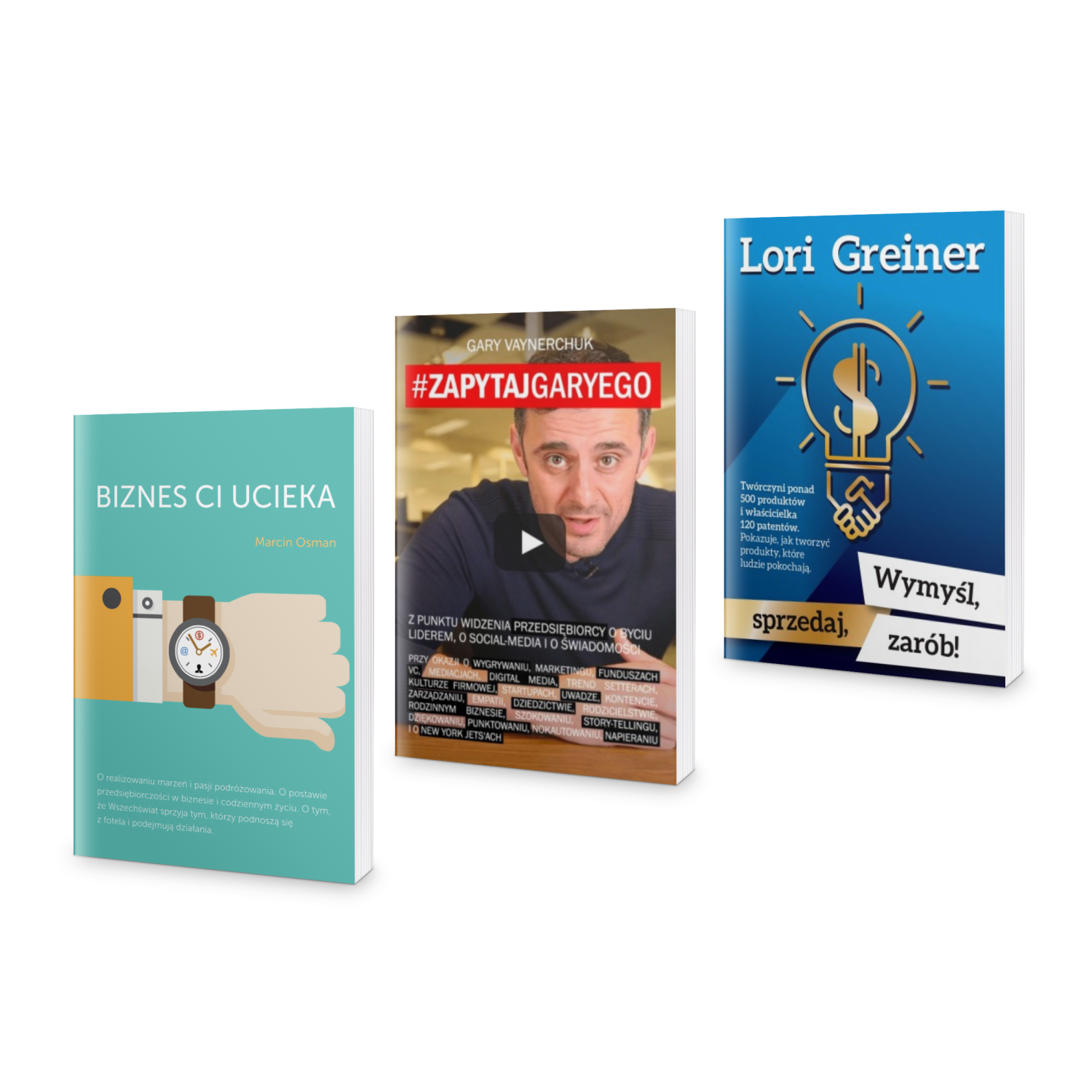 Pakiet KSIĄŻEK DLA POCZĄTKUJĄCYCH PRZEDSIĘBIORCÓW to zestaw 3 książek najlepszych na start w biznesie: Biznes Ci Ucieka; Zapytaj Garyego oraz Wymyśl! Sprzedaj! Zarób!
